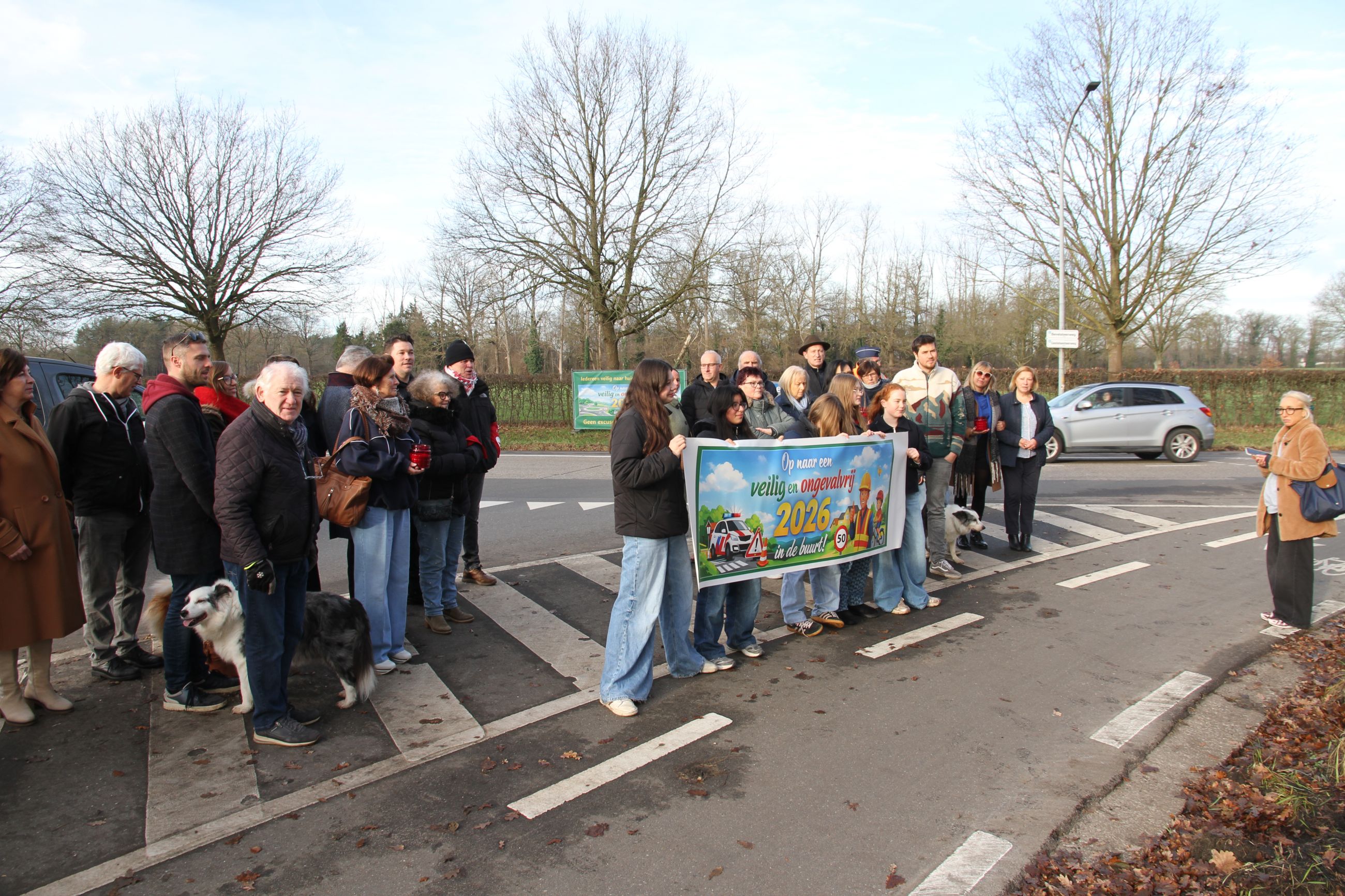 “Begin december is hier weer een fietser zwaar gewond geraakt, die nog steeds in de kliniek ligt”, begint Heremans het verhaal. “Het is slecht het laatste voorbeeld van een lange reeks zware ongevallen op een kruispunt dat door buurtbewoners wordt omschreven als ‘een blinde bocht’. Een bocht met vele littekens waarvan vele incidenten zelfs niet geregistreerd zijn en ook niet in de media verschenen zijn. In het verleden zijn ook al studies gebeurt en nu wordt weer een nieuwe studie bestelt. Wij vragen dat het lokaal bestuur luistert naar de échte experten, de buurtbewoners en mensen die hier dagelijks passeren”. De aanwezigen rolden een spandoek uit met ‘Wij wensen jullie een verkeersveilig en ongevalvrij 2026’.